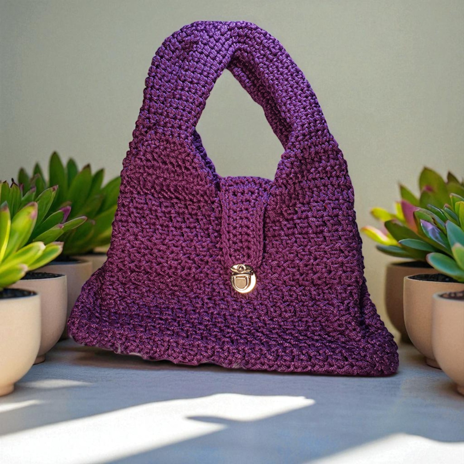Bolso de mano en crochet morado, hecho a mano en poliéster de alta calidad. Elegante, resistente y único, perfecto para destacar con estilo.